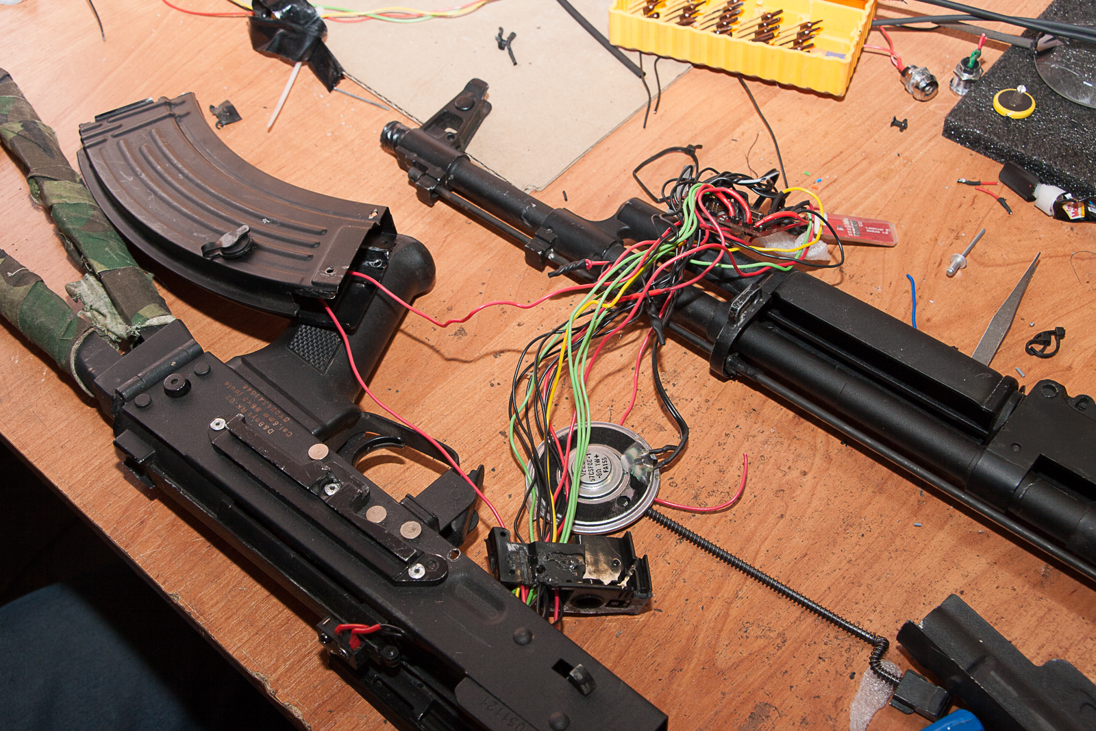 Замена электроники и излучателей превратилась в работу по полной реинтеграции и замене проводки практически на всех комплектах оборудования. Это произошло из-за соответствующего качества первоначальной интеграции, выполненной "ведущими производителями лазертага". Оставляя в стороне обилие привезенных к нам на апгрейд треснувших в первые же полгода клубной эксплуатации пластиковых корпусов и рассыпающихся в руках страйк-приводов*, следует отметить присущую первоначальным интеграторам отчаянную смелость технических решений, граничащую с безумием. Мы, как инженеры, привыкли к более классическим методам, обеспечивающим реальную работоспособность оборудования в течение более длительного времени, чем одна-две игры.